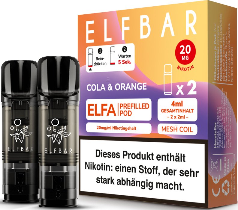 Elfbar ELFA CP Prefilled Pod COLA & ORANGE ca. 600 Züge - Nikotin 2ml Liquid Nikotin 20mg/ml Prefilled-Pod System TPD konform 2er Pack in 10er T-Dsp.(kompatibel mit allen ELFA Basisgeräten)(mit Steuerbanderole)