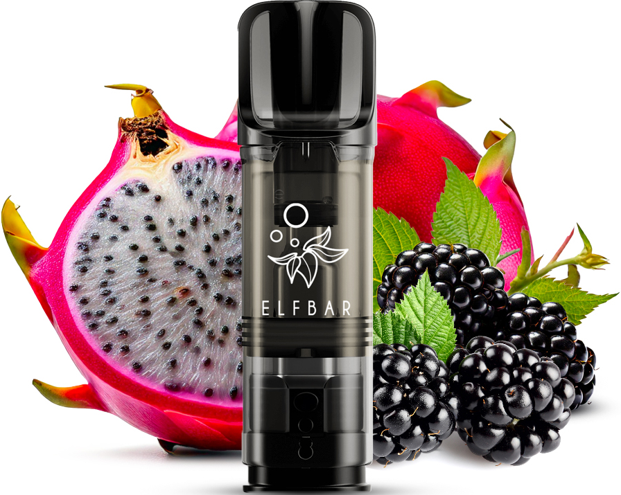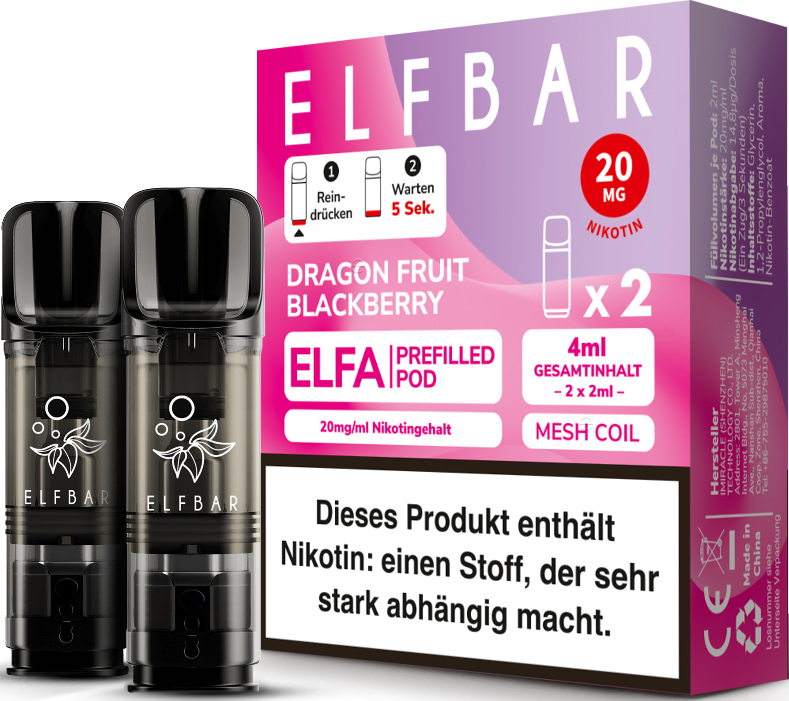 Elfbar ELFA CP Prefilled Pod DRAGON FRUIT BLACKBERRY ca. 600 Züge - Nikotin 2ml Liquid Nikotin 20mg/ml Prefilled-Pod System TPD konform 2er Pack in 10er T-Dsp.(kompatibel mit allen ELFA Basisgeräten)(mit Steuerbanderole)