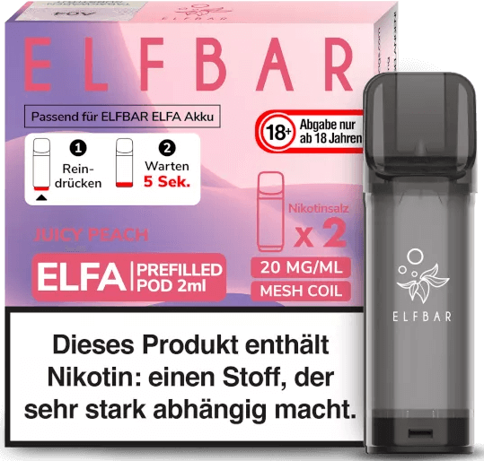 Elfbar ELFA CP Prefilled Pod JUICY PEACH ca. 600 Züge - Nikotin 2ml Liquid Nikotin 20mg/ml Prefilled-Pod System TPD konform 2er Pack in 10er T-Dsp.(kompatibel mit allen ELFA Basisgeräten)(mit Steuerbanderole)