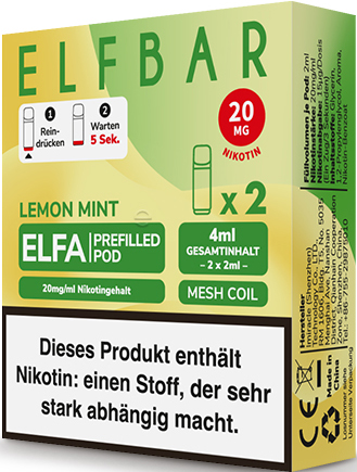 Elfbar ELFA CP Prefilled Pod LEMON MINT ca. 600 Züge - Nikotin 2ml Liquid Nikotin 20mg/ml Prefilled-Pod System TPD konform 2er Pack in 10er T-Dsp.(kompatibel mit allen ELFA Basisgeräten)(mit Steuerbanderole)