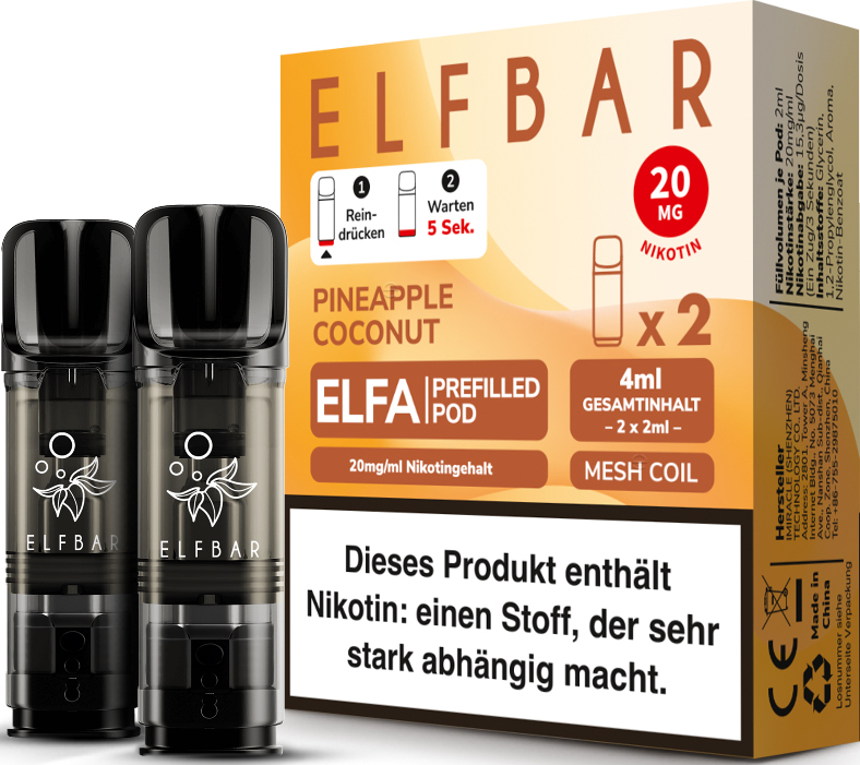 Elfbar ELFA CP Prefilled Pod PINEAPPLE COCONUT ca. 600 Züge - Nikotin 2ml Liquid Nikotin 20mg/ml Prefilled-Pod System TPD konform 2er Pack in 10er T-Dsp.(kompatibel mit allen ELFA Basisgeräten)(mit Steuerbanderole)