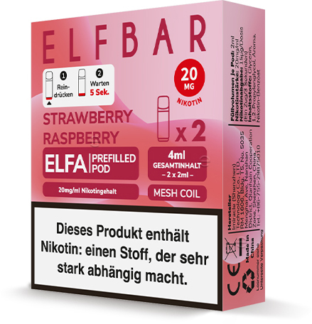 Elfbar ELFA CP Prefilled Pod STRAWBERRY RASPBERRY ca. 600 Züge - Nikotin 2ml Liquid Nikotin 20mg/ml Prefilled-Pod System TPD konform 2er Pack in 10er T-Dsp.(kompatibel mit allen ELFA Basisgeräten)(mit Steuerbanderole)