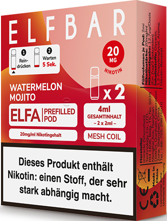 Elfbar ELFA CP Prefilled Pod WATERMELON MOJITO ca. 600 Züge - Nikotin 2ml Liquid Nikotin 20mg/ml Prefilled-Pod System TPD konform 2er Pack in 10er T-Dsp.(kompatibel mit allen ELFA Basisgeräten)(mit Steuerbanderole)