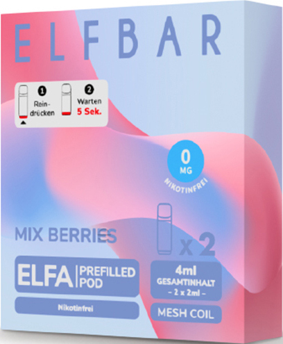 Elfbar ELFA CP Prefilled Pod MIX BERRIES ca. 600 Züge - ohne Nikotin 2ml Liquid Nikotin 0mg/ml Prefilled-Pod System TPD konform 2er Pack in 10er T-Dsp.(kompatibel mit allen ELFA Basisgeräten)(mit Steuerbanderole)