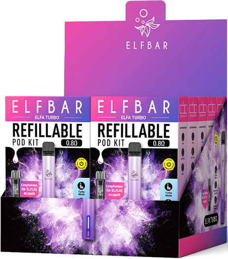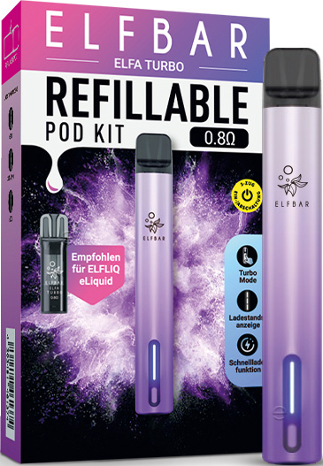 Elfbar ELFA TURBO Basisgerät AURORA PURPLE - inkl. 1x Refillable Pod, mit Kindersicherung, Betteriestatus-Anzeige, Akku Kapazität: 550mAh & Turbo-Modus aufladbar mit USB-C Ladekabel (inkl.), magnetische Pod Aufnahme in 10er T-Dsp.(kompatibel mit allen ELFA Pods)