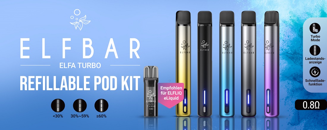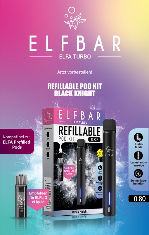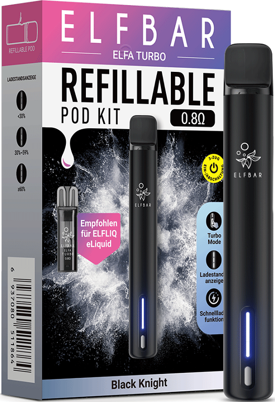 Elfbar ELFA TURBO Basisgerät BLACK KNIGHT - inkl. 1x Refillable Pod, mit Kindersicherung, Betteriestatus-Anzeige, Akku Kapazität: 550mAh & Turbo-Modus aufladbar mit USB-C Ladekabel (inkl.), magnetische Pod Aufnahme in 10er T-Dsp.(kompatibel mit allen ELFA Pods)