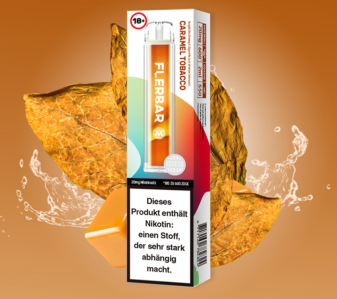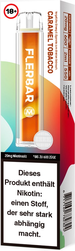 Flerbar M 600 E-Shisha CARAMEL TOBACCO ca. 600 Züge - mit Kindersicherung, Nikotin 2ml Liquid Nikotin 20mg/ml 550mAh Einweg-Pos System TPD konform 10er T-Dsp.(mit Steuerbanderole)