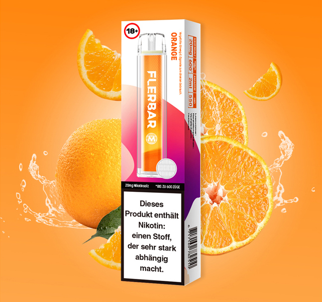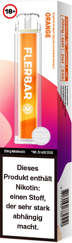 Flerbar M 600 E-Shisha ORANGE ca. 600 Züge - mit Kindersicherung, Nikotin 2ml Liquid Nikotin 20mg/ml 550mAh Einweg-Pos System TPD konform 10er T-Dsp.(mit Steuerbanderole)