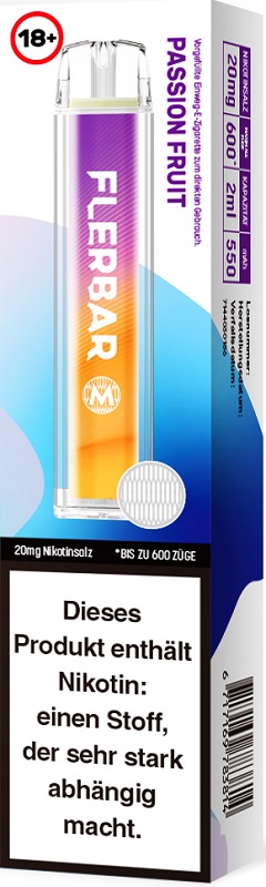 Flerbar M 600 E-Shisha PASSION FRUIT ca. 600 Züge - mit Kindersicherung, Nikotin 2ml Liquid Nikotin 20mg/ml 550mAh Einweg-Pos System TPD konform 10er T-Dsp.(mit Steuerbanderole)