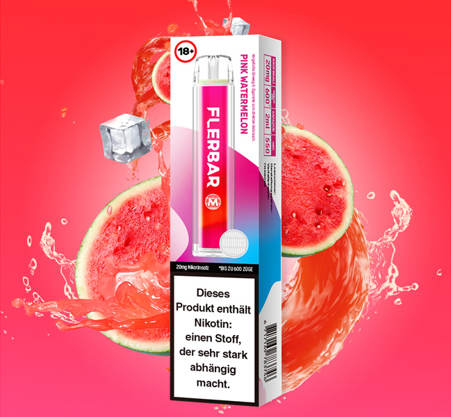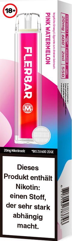Flerbar M 600 E-Shisha PINK WATERMELON ca. 600 Züge - mit Kindersicherung, Nikotin 2ml Liquid Nikotin 20mg/ml 550mAh Einweg-Pos System TPD konform 10er T-Dsp.(mit Steuerbanderole)