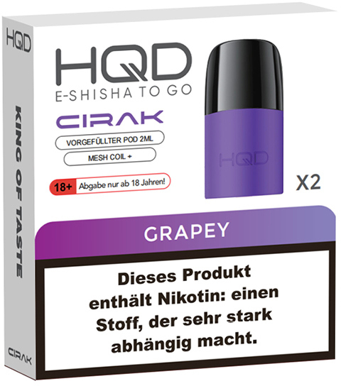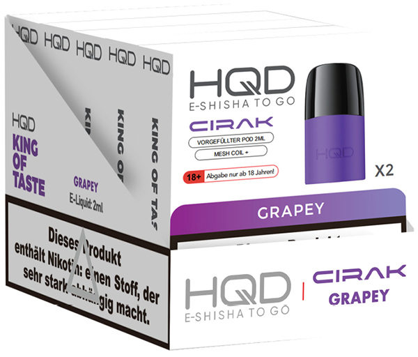 HQD Cirak Prefilled Pod GRAPEY ca. 600 Züge - Nikotin 2ml Liquid Nikotin 18mg/ml Prefilled-Pod System TPD konform 2er Pack im 5er T-Dsp.(kompatibel mit allen Cirak Basisgeräten)(mit Steuerbanderole)