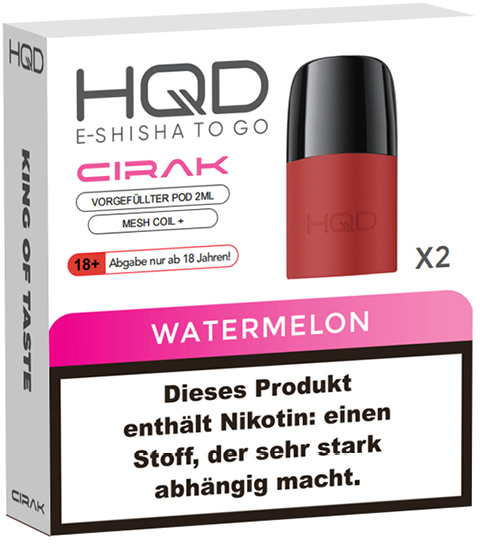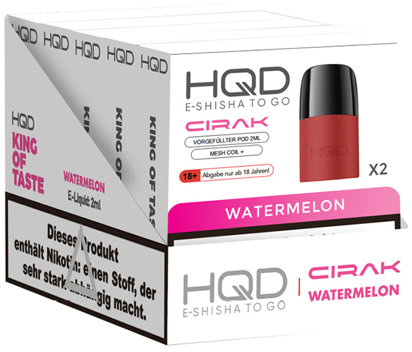 HQD Cirak Prefilled Pod WATERMELON ca. 600 Züge - Nikotin 2ml Liquid Nikotin 18mg/ml Prefilled-Pod System TPD konform 2er Pack im 5er T-Dsp.(kompatibel mit allen Cirak Basisgeräten)(mit Steuerbanderole)