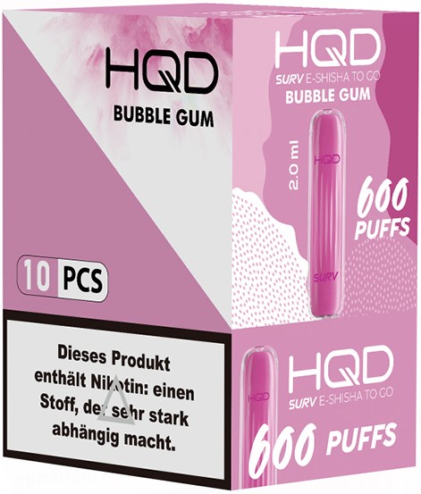 HQD SURV E-Shisha CHEWIE BUBBLE GUM(Kaugummi) - Nikotin 2ml Liquid Nikotin 20mg/ml ca. 600 Züge 400mAh Einweg-Pos System TPD konform 10er T-Dsp.(mit Steuerbanderole)