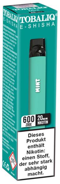 TobaliQ E-Shisha TQ-Smile E-Shisha MINT ca. 600 Züge - Nikotin 2ml Liquid Nikotin 20mg/ml 550mAh Einweg-Pos System TPD konform 10er T-Dsp.(mit Steuerbanderole)