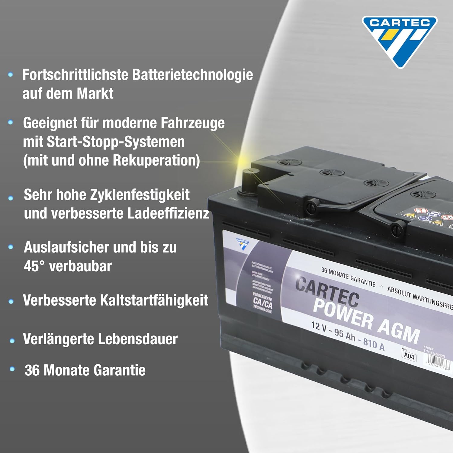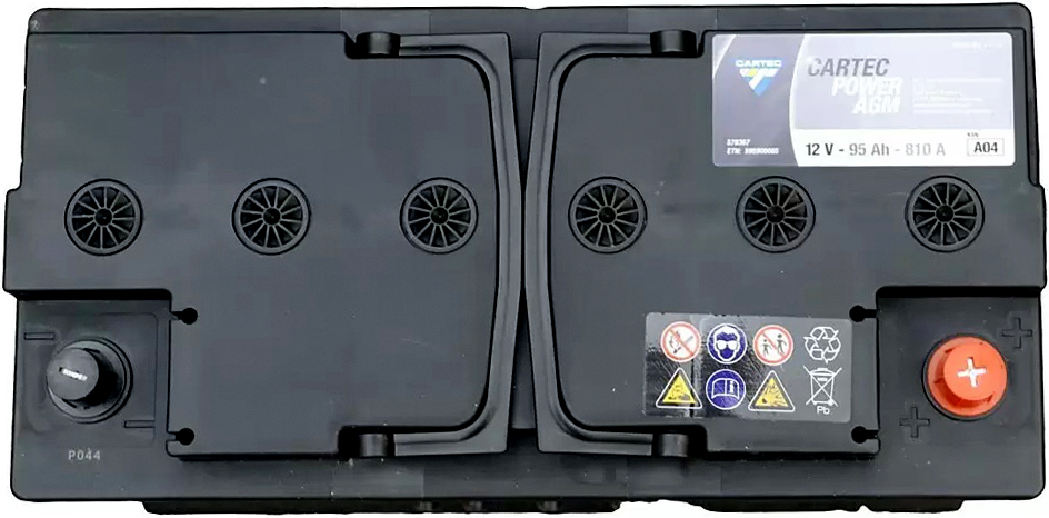 CARTEC POWER AGM Starterbatterie 95 AH / 810 A (KSN A04) - Wartungsfrei, geeignet für moderne Fahrzeuge mit Start-Stopp-Systemen (mit & ohne Rekuperation), sehr hohe Zyklenfestigkeit & verbesserte Ladeeffizienz, Auslaufsicher & bis zu 45° verbaubar, verbesserte Kaltstartfähigkeit, fortschrittlichste Betterietechnologie auf dem Markt (Kaltstartstrom 810A, verlängerte Lebensdauer + 36 Monate Garantie)